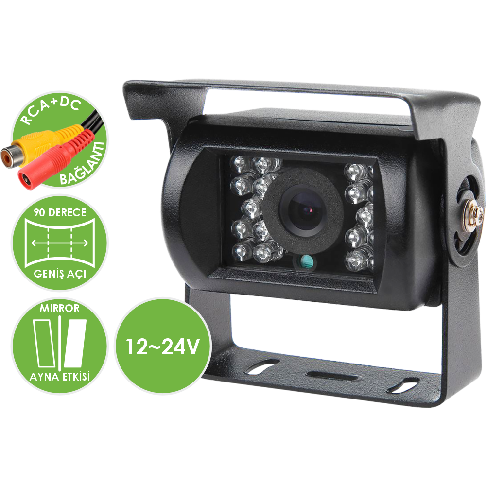 Kamera Özellikleri Resim Sensörü 1/3" Cmos Çözünürlük 480 TVLine Çözünürlük Türü SD Resim Çözünürlüğü 704x576 Piksel Lens 2.8mm Görüntüleme Açısı 90 Derece LED Sayısı 18 Adet IR LED Gece Görüş Mesafesi 1~5m Sinyal Sistemi PAL Mikrofon Yok OSD Menü Yok Mirror (Ayna Etkisi) Var (Ayarlanabilir) Dahili Park Sensörü Yok Park Çizgileri Var (Ayarlanabilir) Kablosuz Bağlantı Desteği Yok Kasa Türü Metal Kullanım Alanı Araç Kamerası, Geri Görüş Kamerası Güç Gereksinimi 12~24V DC Güç Tüketimi 30MA~150MA (Gündüz/Gece)