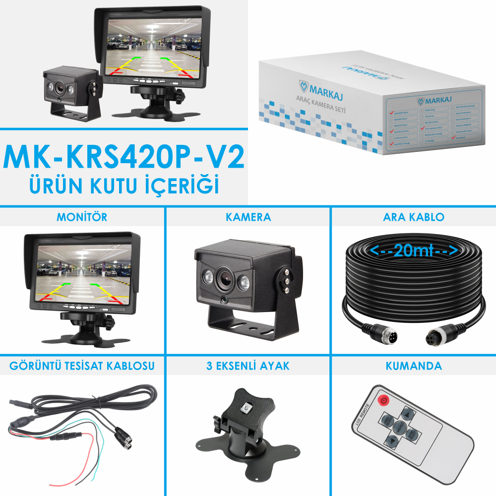 Gönder Paylaş Gönder MK-KRS420P-V2 7 Inch Monitörlü AHD Geri Görüş Karavan Kamera Seti Marka: Markaj Ürün Kodu: MK-KRS420P-V2 Stok Durumu: Stokta Var Hazırlanma Süresi: 2 İş Günü Tahmini Sevk Tarihi: 20 Nisan 2026 Pazartesi ÜRÜN SET İÇERİĞİ 1 ADET MONİTÖR 1 ADET DIŞ ORTAM KAMERA 1 ADET 20M 4PİN TESİSAT KABLOSU
