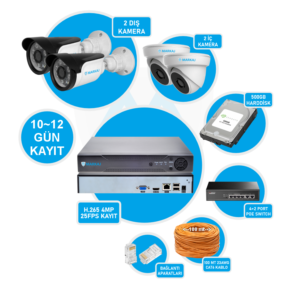 Gönder Paylaş Gönder MK-S804NVRE 4 Megapiksel IP 4 Kameralı Ev ve İşyeri Kamera Seti Marka: Markaj Ürün Kodu: MK-S804NVRE Stok Durumu: Stokta Var Hazırlanma Süresi: 2 İş Günü Tahmini Sevk Tarihi: 20 Nisan 2026 Pazartesi ÜRÜN SET İÇERİĞİ 1 ADET KAYIT CİHAZI 1 ADET HARDDİSK 2 ADET DIŞ ORTAM KAMERA 2 ADET İÇ ORTAM KAMERA 1 ADET POE SWITCH