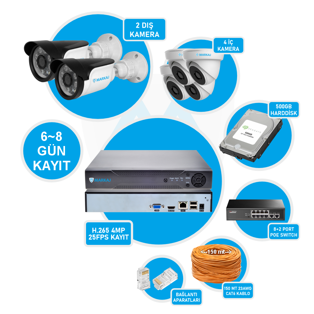 Gönder Paylaş Gönder MK-S806NVRE 4 Megapiksel IP 6 Kameralı Ev ve İşyeri Kamera Seti Marka: Markaj Ürün Kodu: MK-S806NVRE Stok Durumu: Stokta Var Hazırlanma Süresi: 2 İş Günü Tahmini Sevk Tarihi: 20 Nisan 2026 Pazartesi ÜRÜN SET İÇERİĞİ 1 ADET KAYIT CİHAZI 1 ADET HARDDİSK 2 ADET DIŞ ORTAM KAMERA 4 ADET İÇ ORTAM KAMERA 1 ADET POE SWITCH